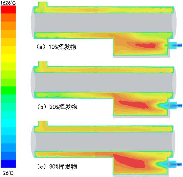 圖3:旋轉(zhuǎn)反應(yīng)器橫截面上的溫度分布:(a)用于燃燒的碳化揮發(fā)物的10%;(b)用于燃燒的碳化揮發(fā)物的20%;(c)30%用于燃燒的碳化揮發(fā)物。